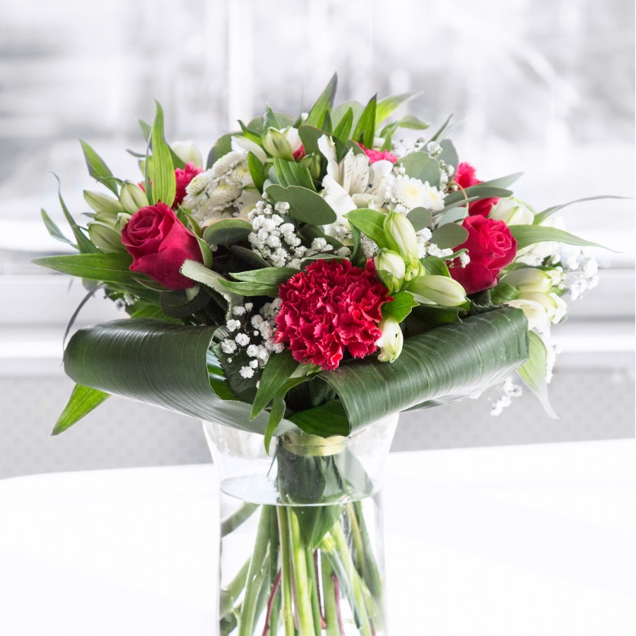 Immerse yourself in the captivating beauty of our Exquisite Elegance Bouquet. This stunning arrangement showcases a harmonious blend of vibrant red roses and delicate white chrysanthemums, accented by lush gypsophila and elegant aspidistra leaves. Each flower is hand-selected to ensure peak freshness and unmatched quality.